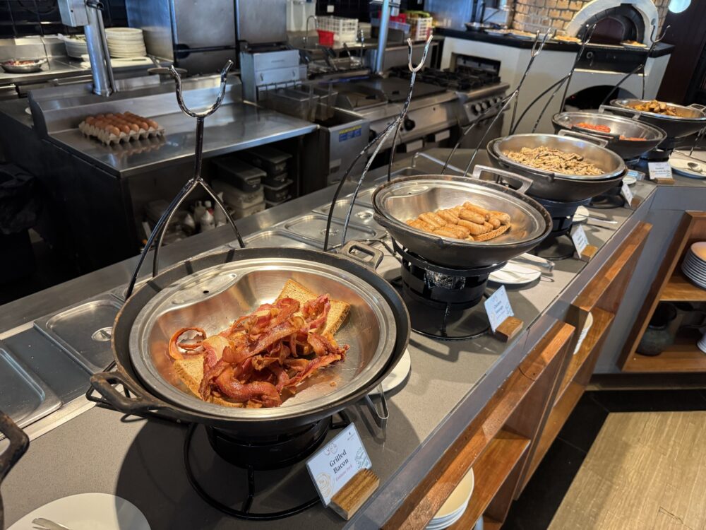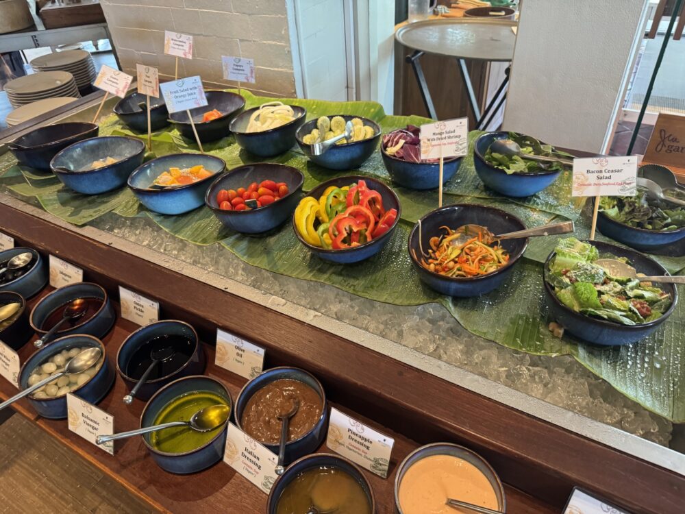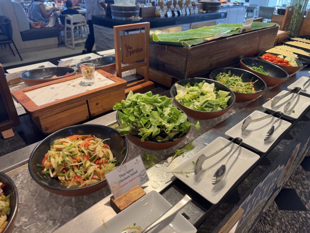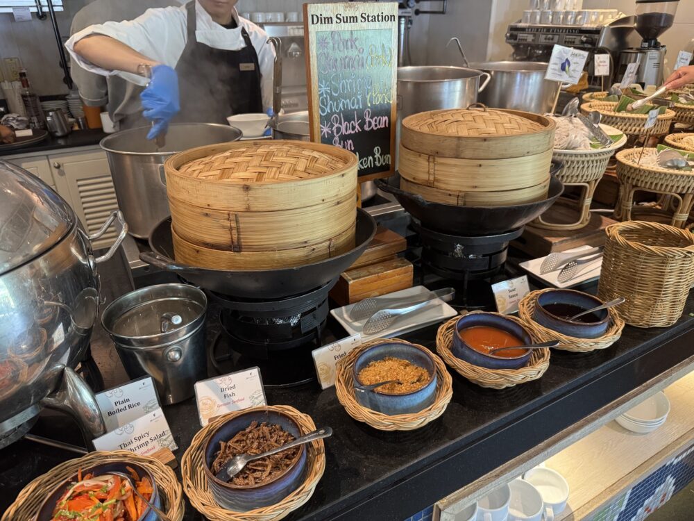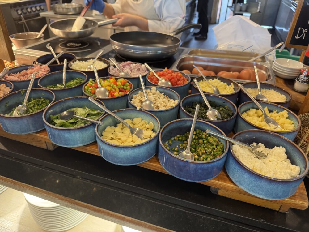 ビュッフェの品数は豊富で、洋食からタイ料理、中華、日本食まで幅広いラインナップ。オムレツやエッグベネディクトなどのライブクッキングステーションもあり、出来立ての料理を楽しめます。