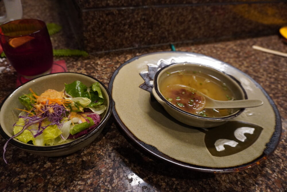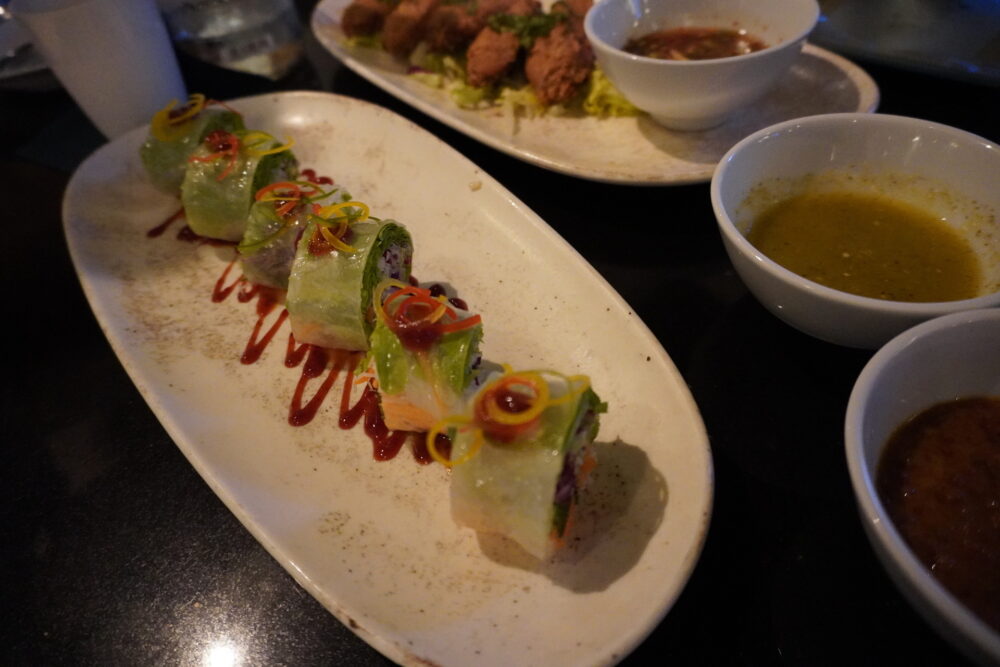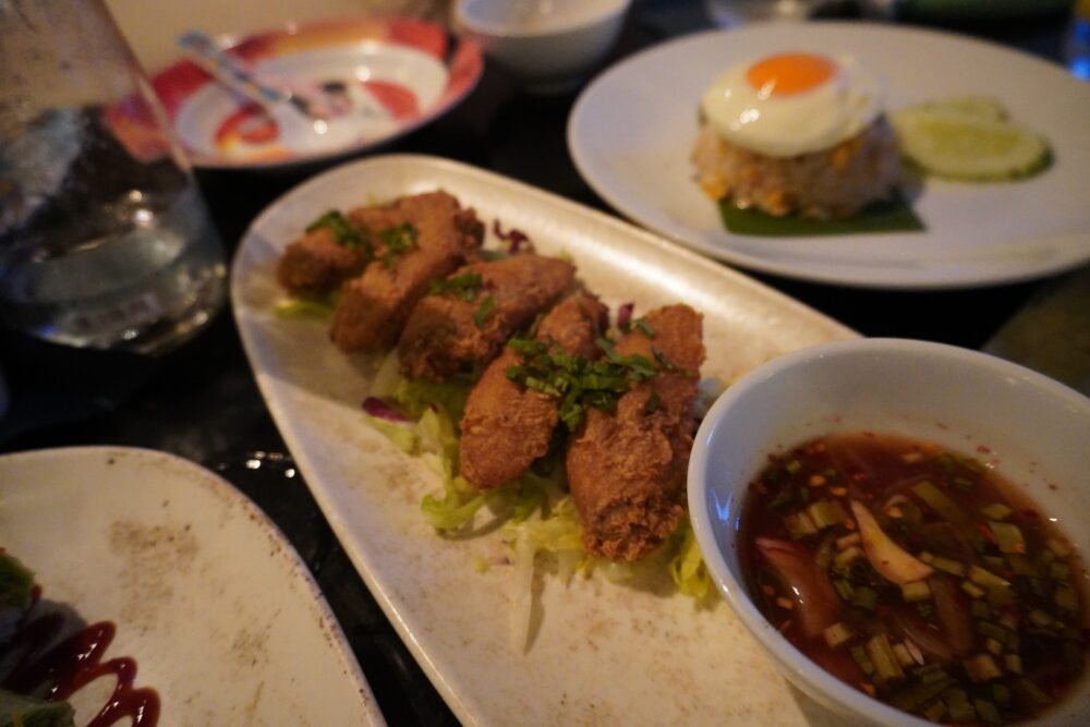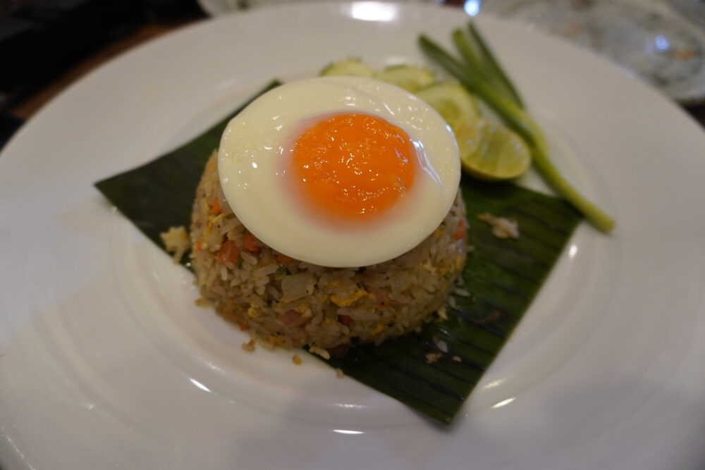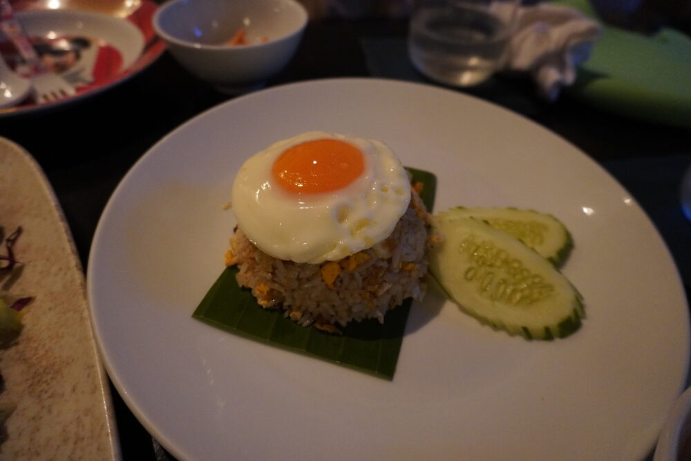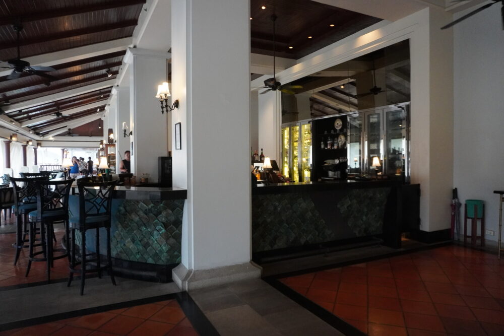 初日の夜はロビーバー「Sala Sawasdee」でいただきました。到着が遅かったこともあり、レストランは21:50以降でないと入れないとのこと。ロビーバーは12:00〜24:00まで営業しているので、遅い時間の食事には助かります。カクテルやワインとともに軽食が楽しめます。