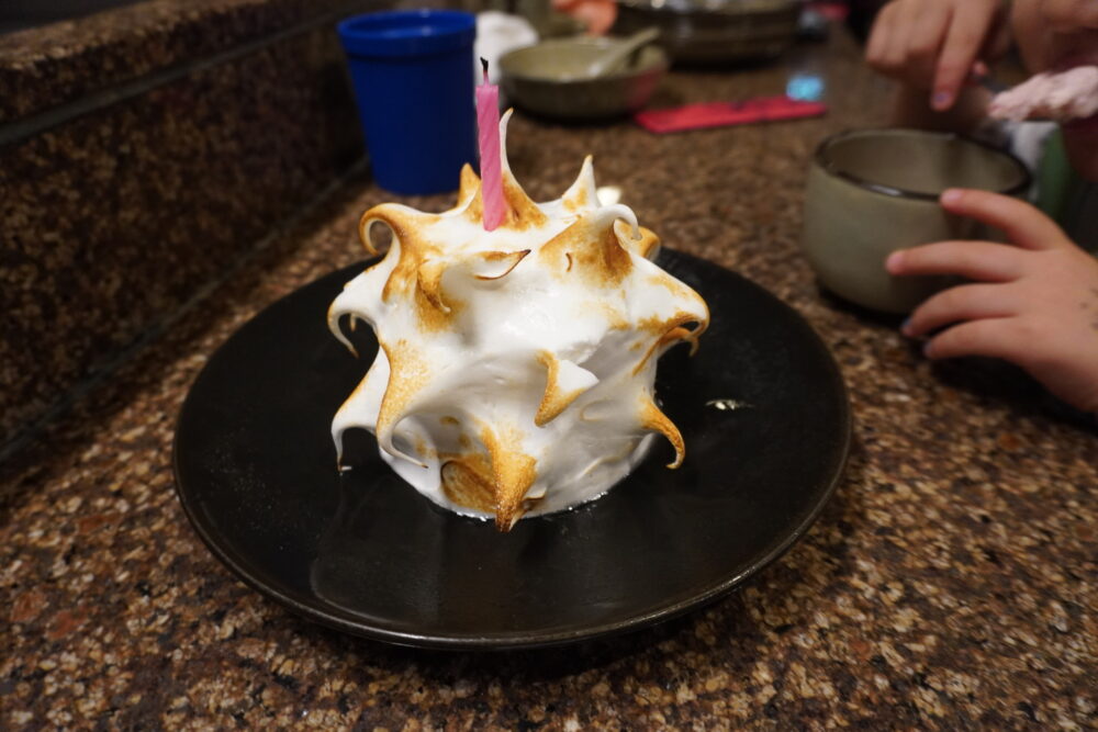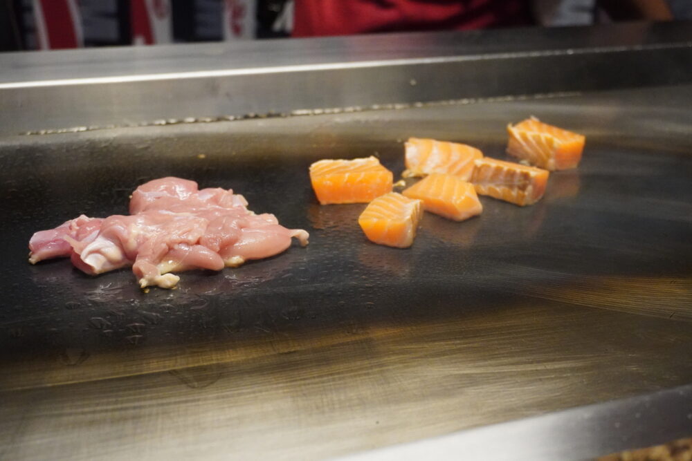 鉄板焼きのライブパフォーマンスは子連れにぴったりのエンターテインメント。お料理の味も本格的で、ステーキやシーフードを堪能しました。