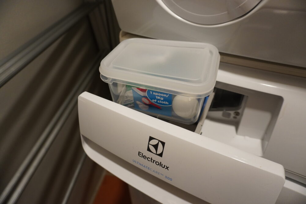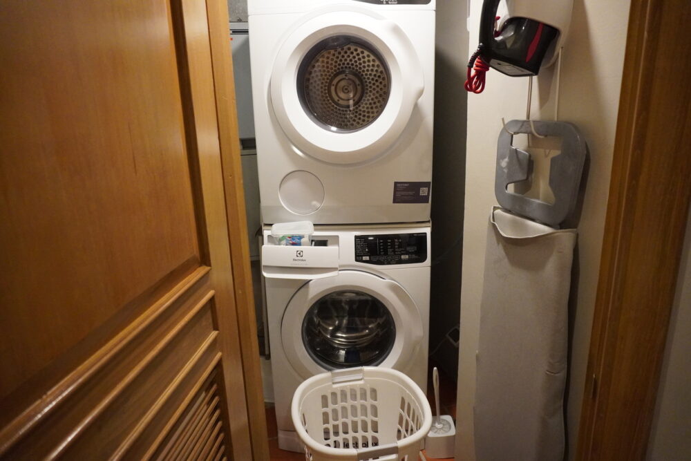洗濯機と乾燥機が部屋についているのは子連れ旅行にはかなりありがたいポイント。洗剤も用意されていました。子どもの服は汚れやすいので、毎日洗濯できるのは助かります。