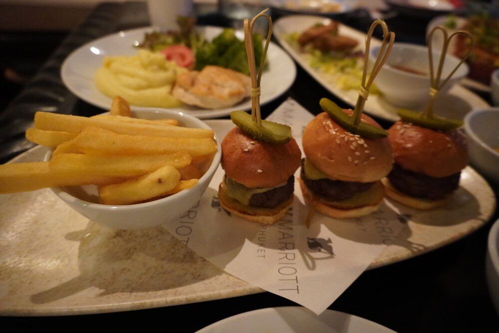 ミニバーガーやフライドポテトなど、カジュアルなメニューが中心。ライブミュージックが流れる中、リラックスした雰囲気で食事を楽しめました。