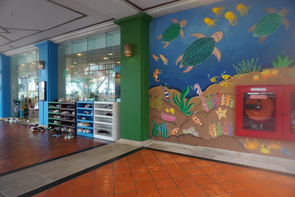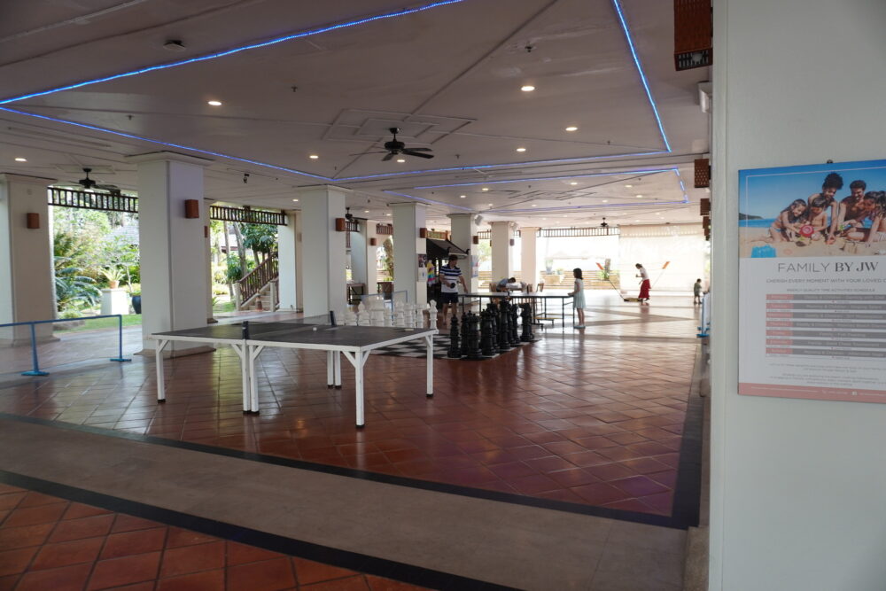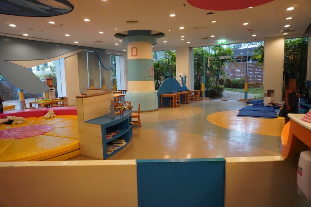 JWマリオットのキッズクラブは最近リニューアルされたばかりで、明るくてきれいな空間です。利用時には靴下が必須なのでご注意ください。滞在中は大雨の日が多かったこともあり、キッズクラブは子どもたちでいっぱいでした。