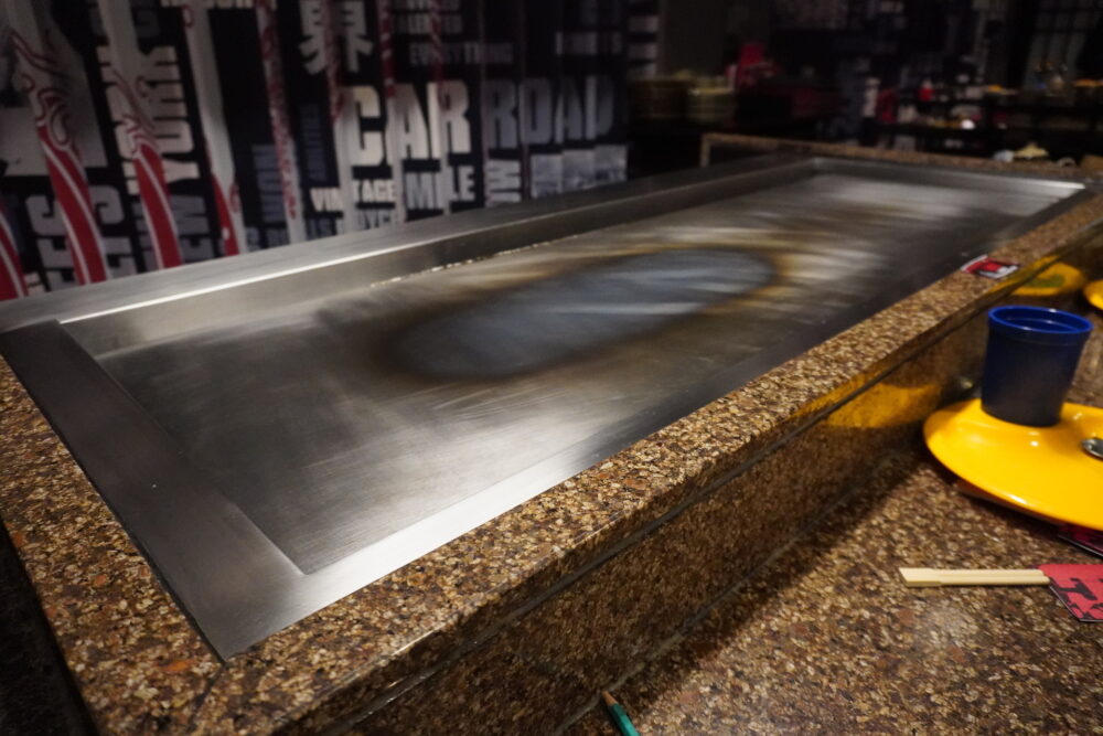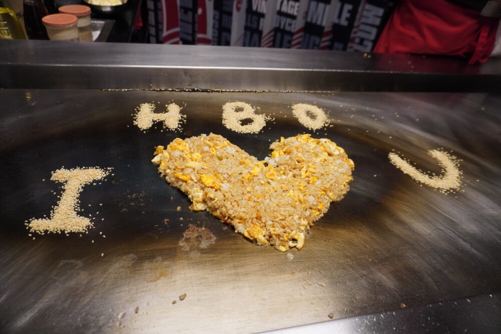 BENIHANAはシェフが目の前で調理する鉄板焼きレストラン。ランチ12:00〜14:30、ディナー17:00〜23:00の営業です。子ども達はシェフのダイナミックなパフォーマンスに釘付けでした。