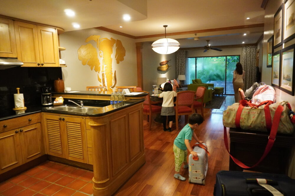 今回宿泊したのは2ベッドルーム。フルキッチン、リビング・ダイニングエリア、洗濯機・乾燥機まで完備されていて、子連れの長期滞在にも対応できる充実した設備です。部屋はかなり広く、家族4人でもゆったり過ごせました。
