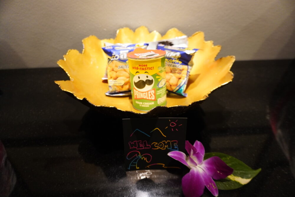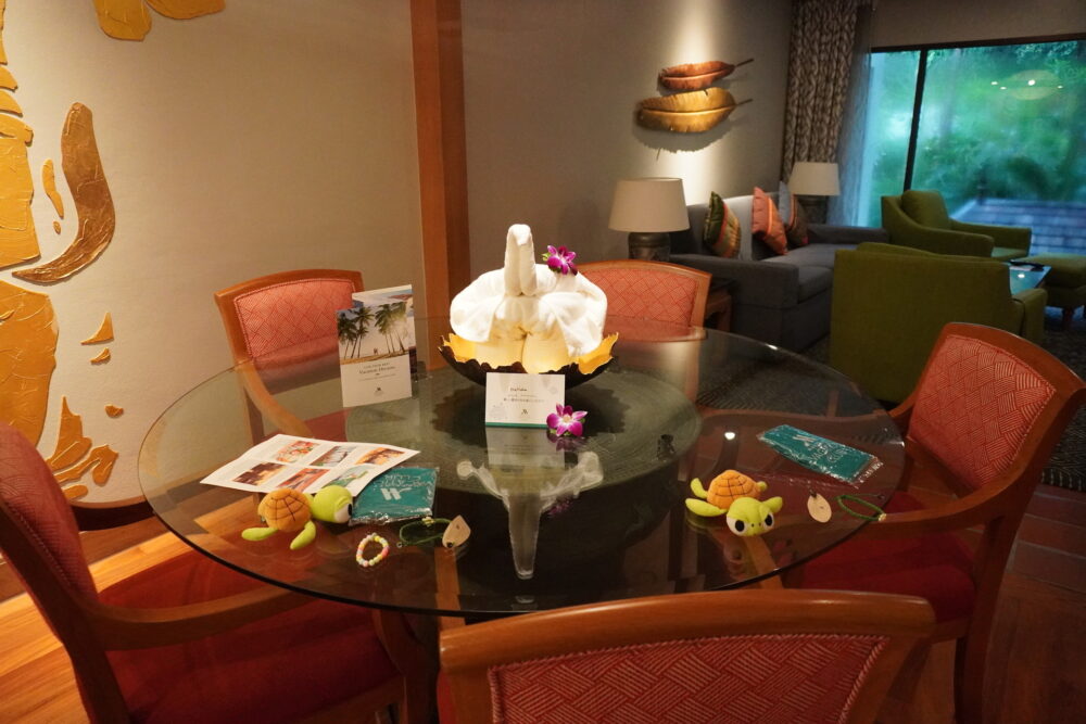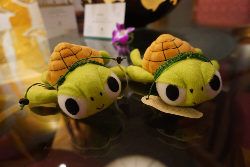 チェックイン時に子ども達がもらったウミガメのぬいぐるみ。マイカオビーチはウミガメの産卵地としても知られており、リゾートのシンボルにもなっています。子ども達は大喜びでした。