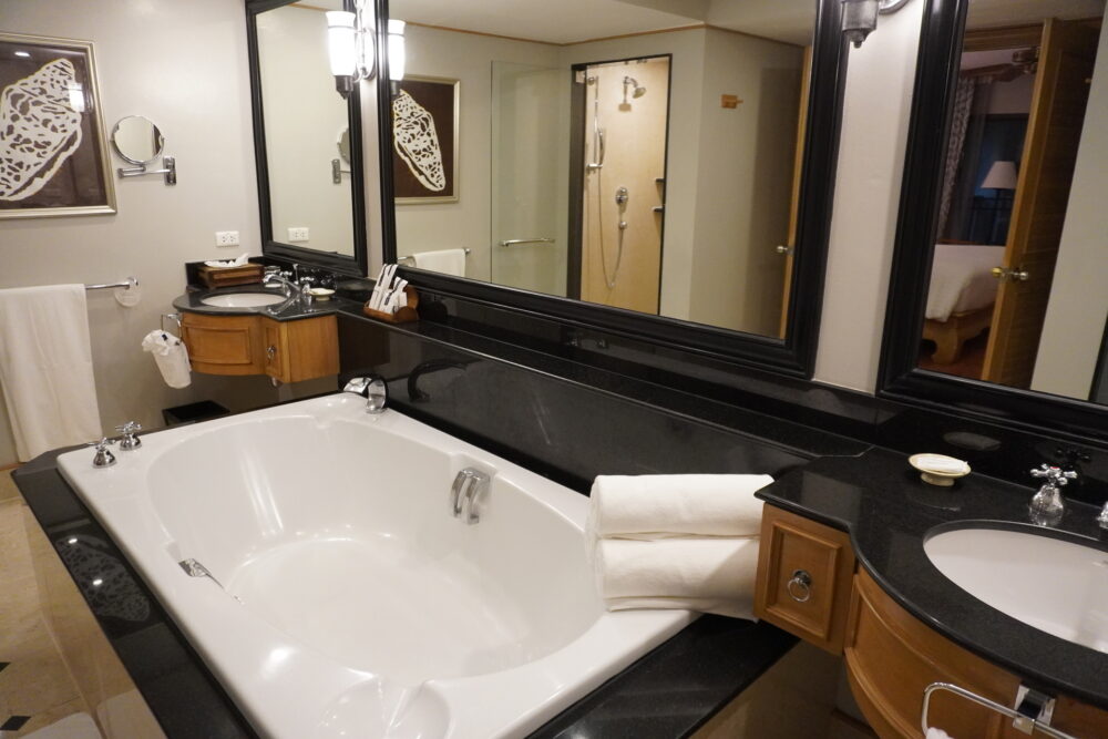 バスルームにはバスタブも完備。ただし、お湯を貯めると少し黄色っぽくなるのはプーケットの水質の特徴です。シャワーで使う分には気にならないレベルでした。